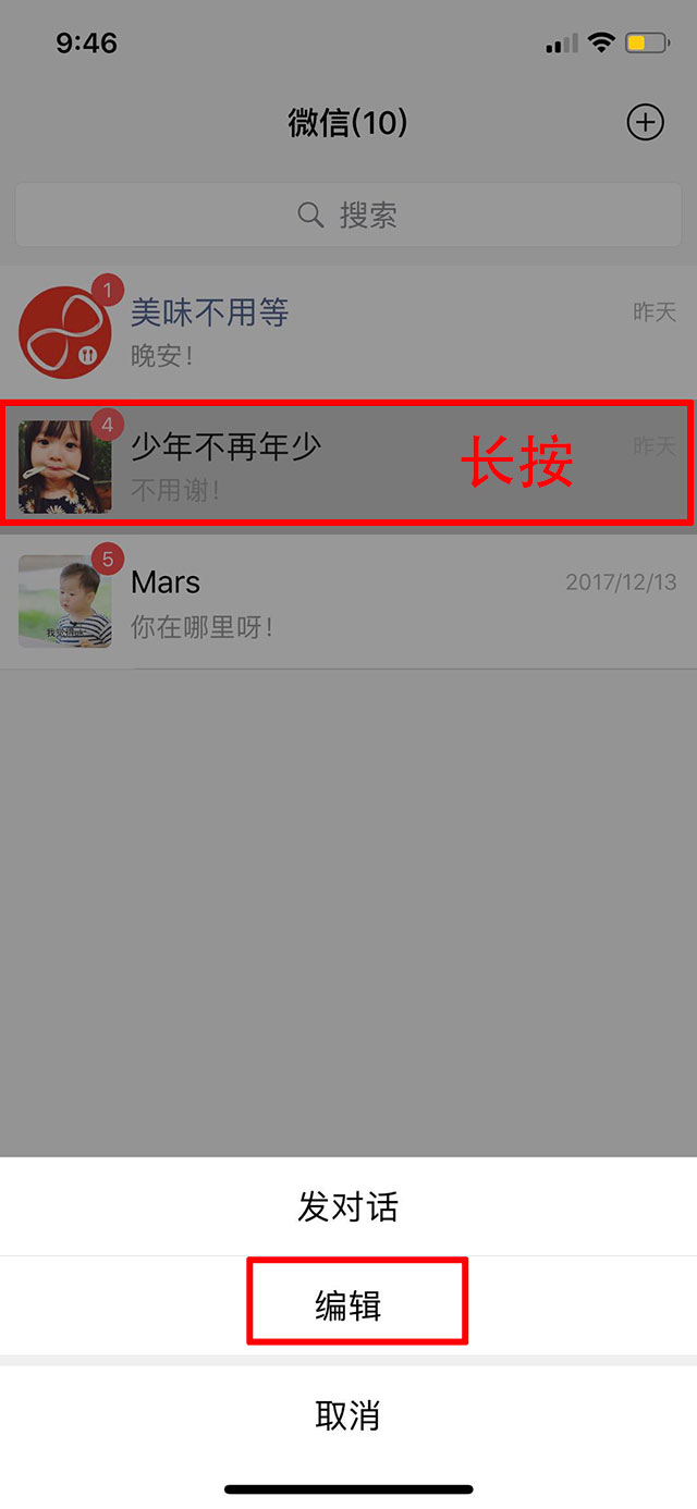 6.如果想编辑该公众号记录,可以长按该记录,选择编辑