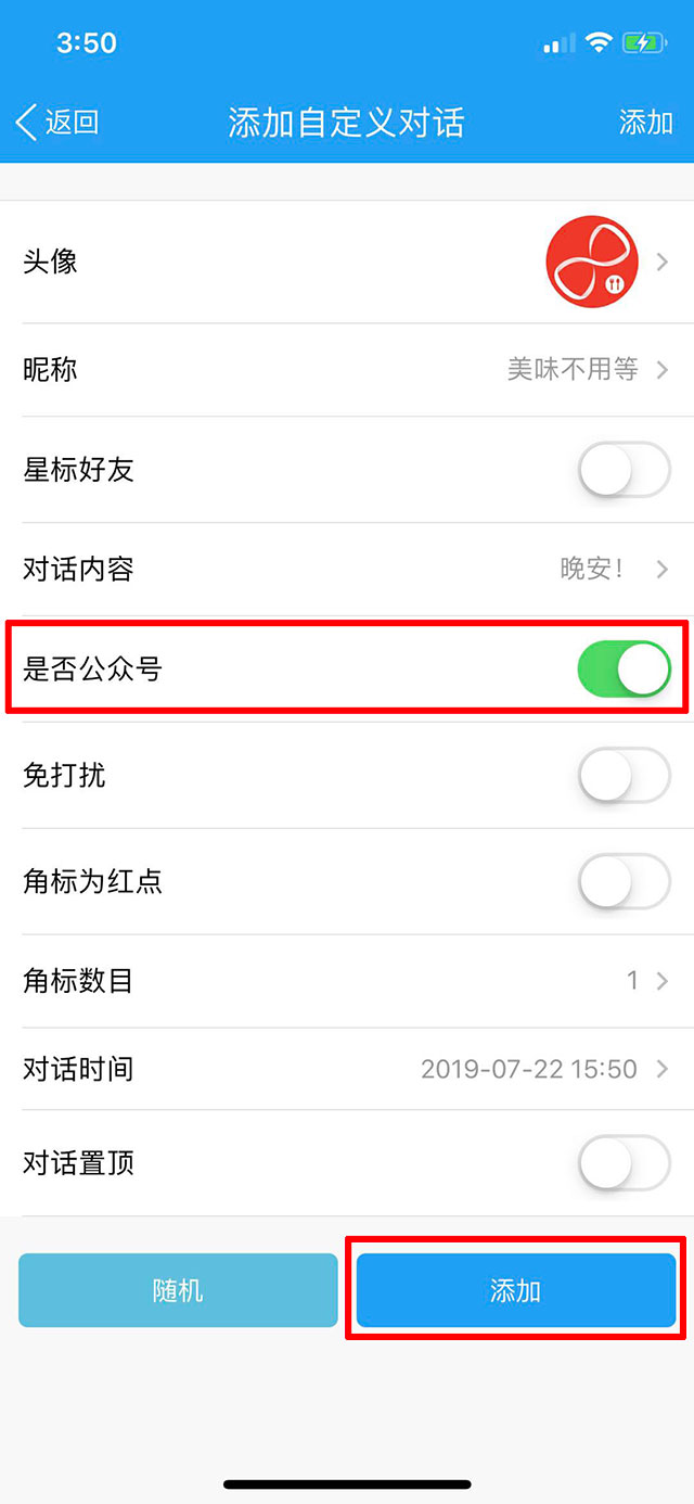 4.填写公众号信息、对话内容、对话时间等。打开“是否公众号”按钮,然后选择添加