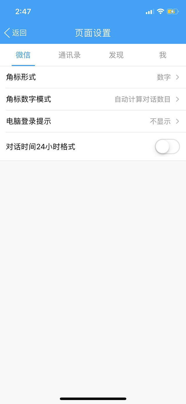 3.页面设置可以设置微信首页的角标数字、电脑登录提示、对话记录右边时间的格式