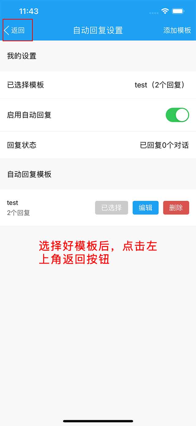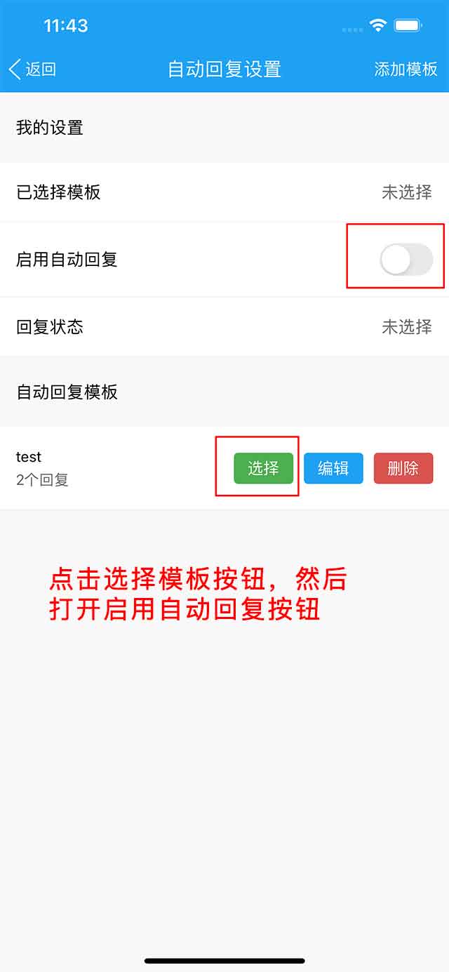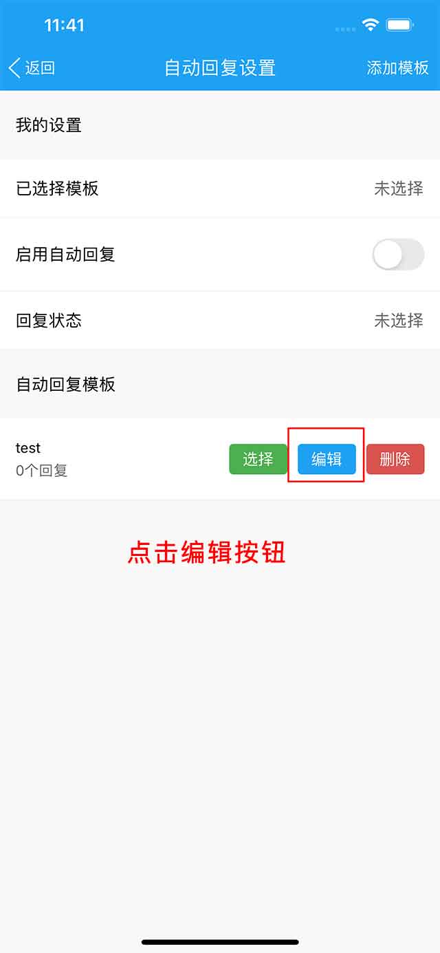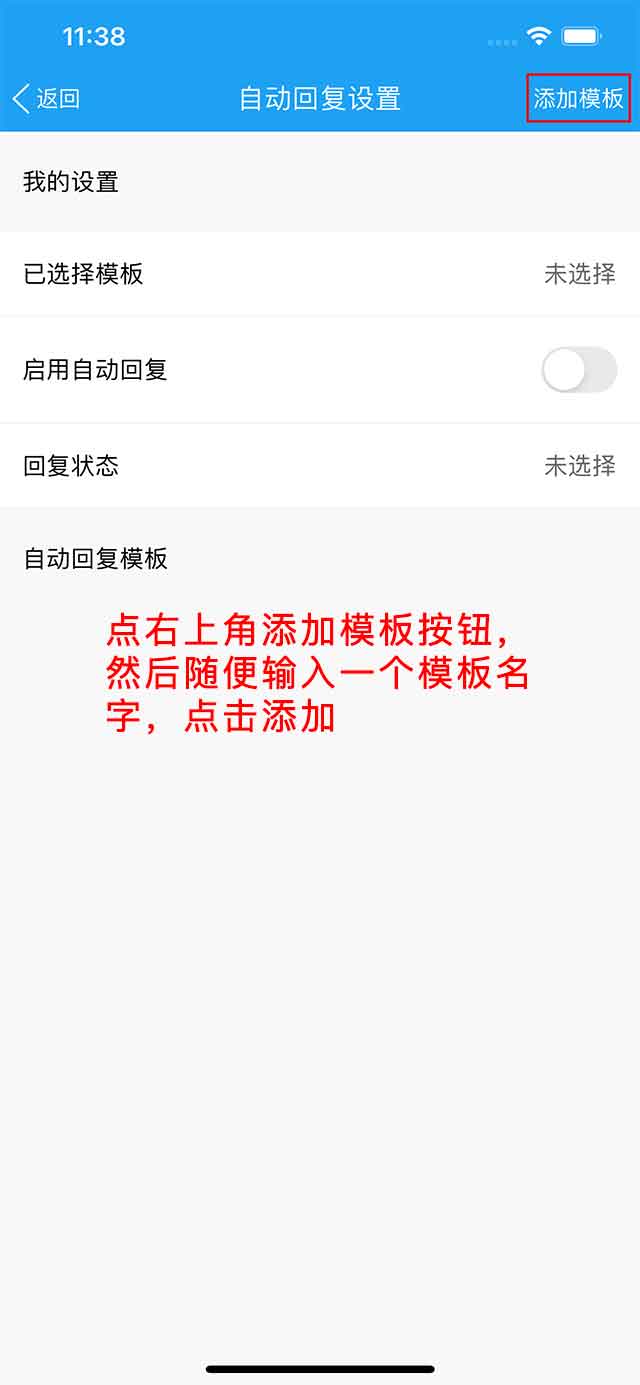 添加自动回复模板,点击右上角添加模板按钮,然后随便输入一个模板的名字,点击添加即可