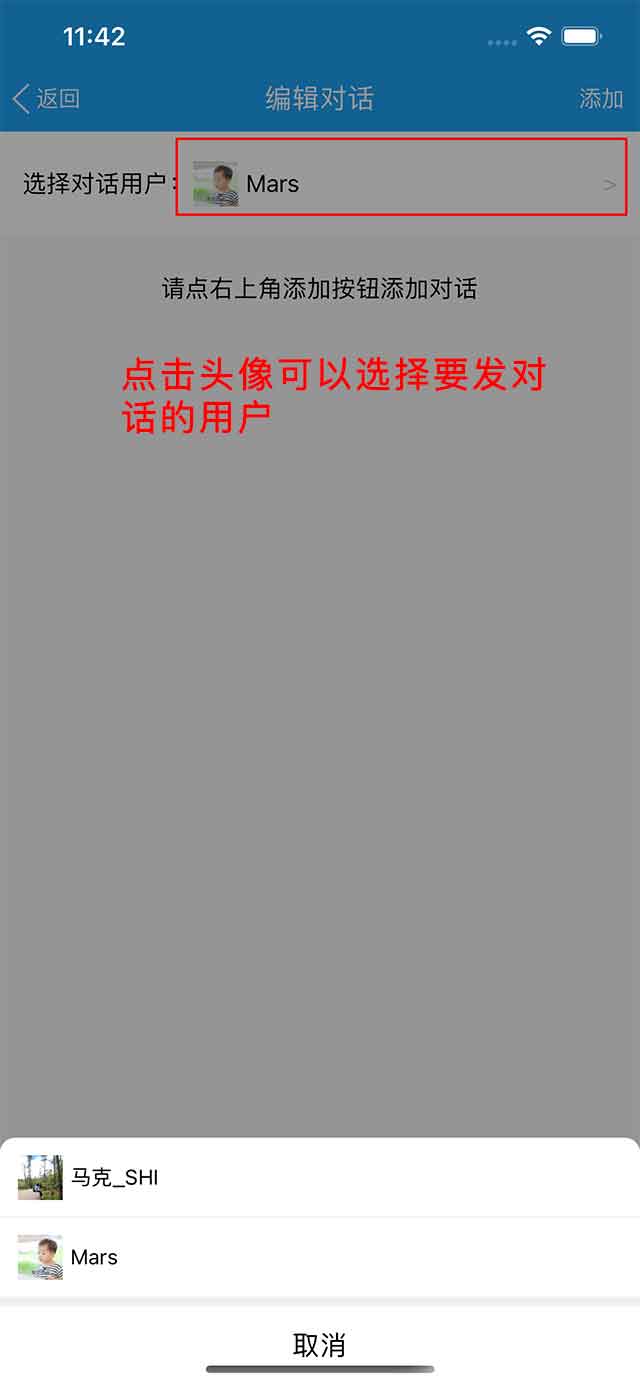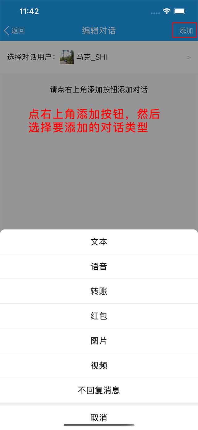 添加对话内容,点用户头像,可以选择需要发对话的用户,然后点右上角添加按钮,可以选择添加文字、语音、图片、视频等对话内容