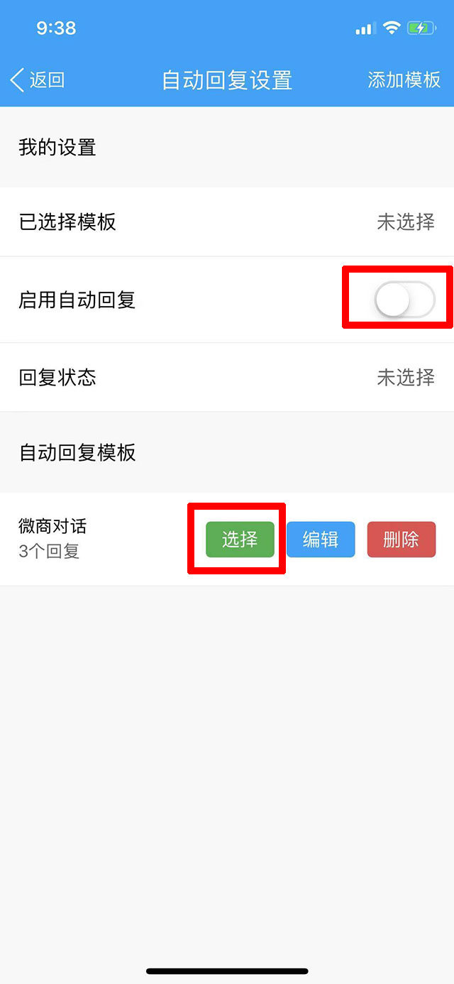 5.在自动回复设置页面里选择自动回复模板,然后打开启用自动回复按钮