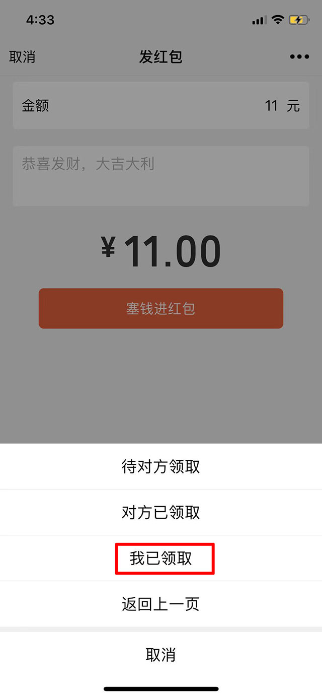 3.在弹出的菜单中选择你要生成的页面类型,包括待对方领取页面、对方已领取页面和我已领取页面
