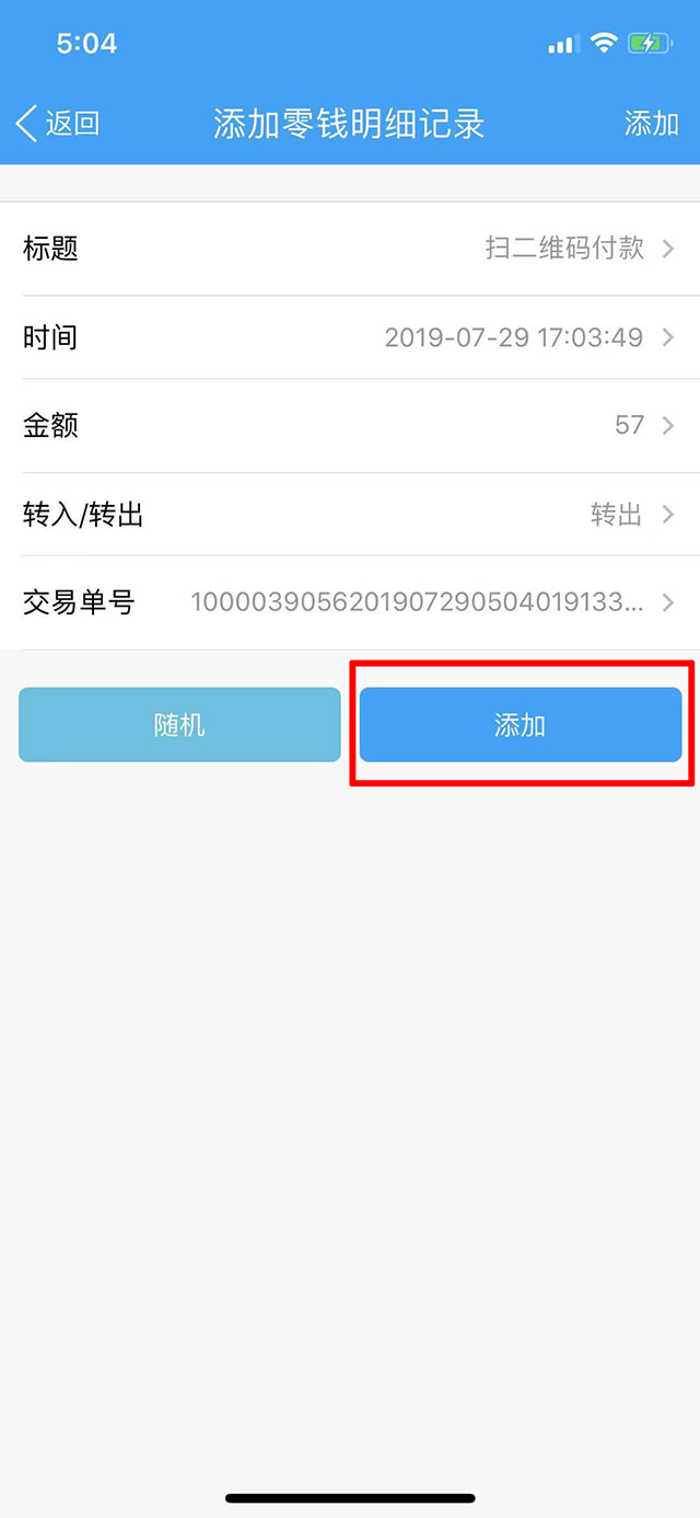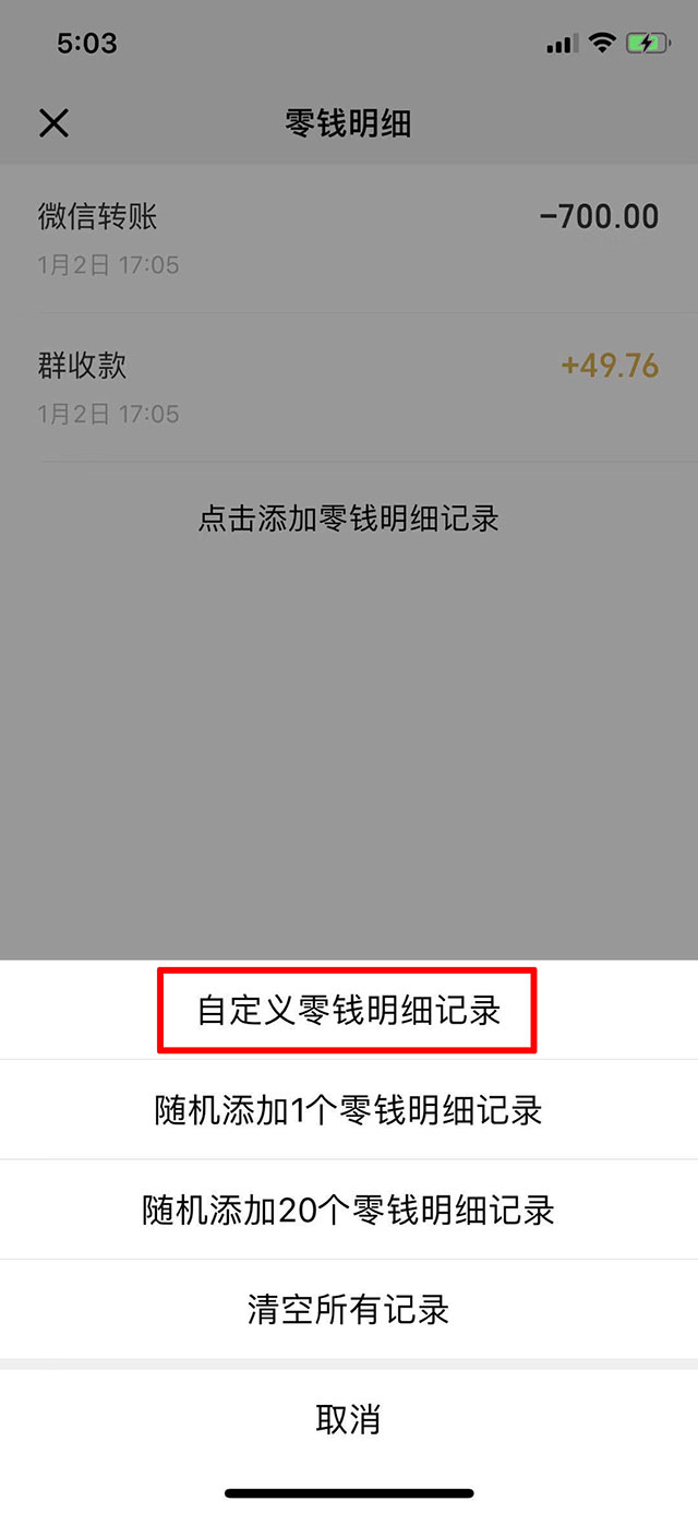 3.选择添加自定义零钱明细记录(或者可以选择随机生成零钱明细记录)